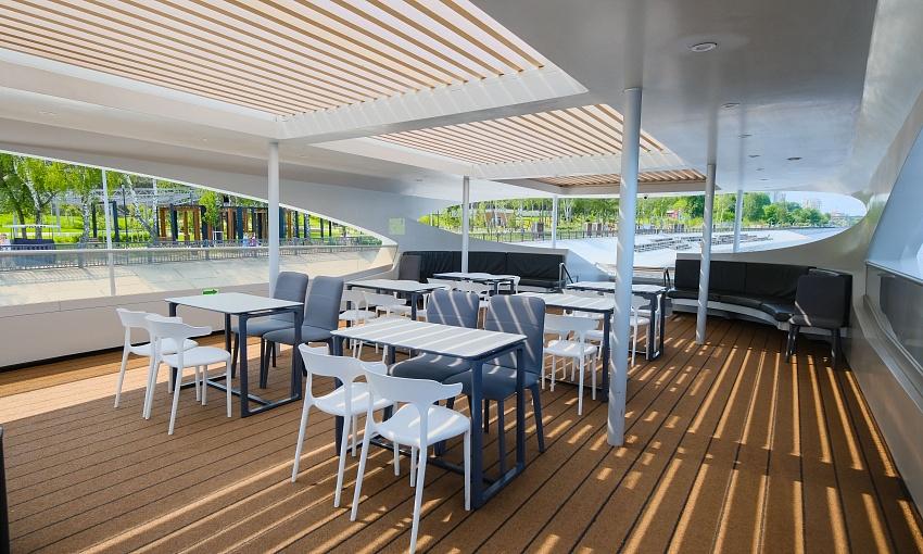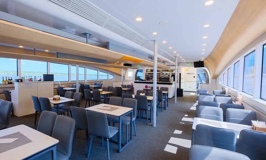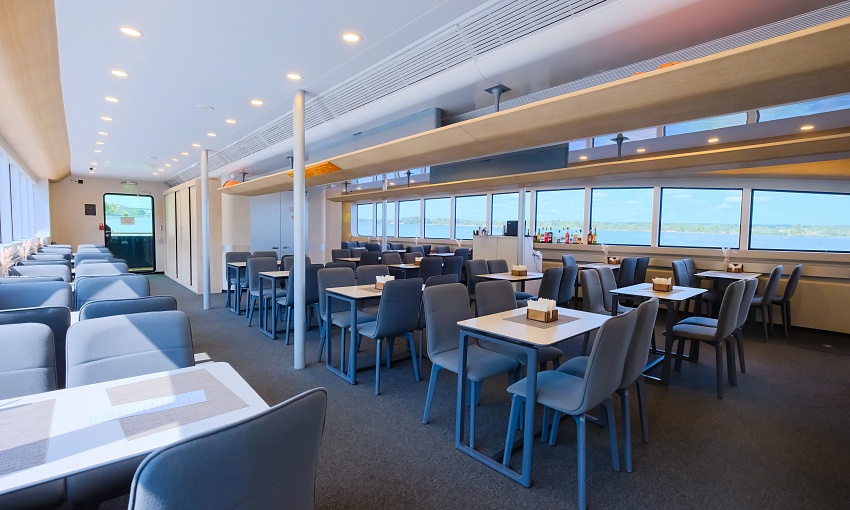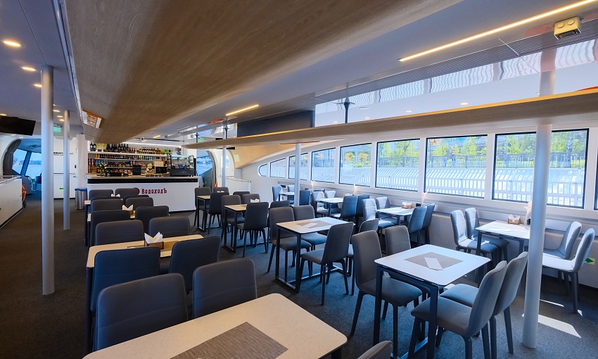 Судно отличается широкой палубой, устойчивостью на воде и прекрасной обзорностью — панорамное остекление и открытые зоны позволяют видеть реку с любой точки катамарана.